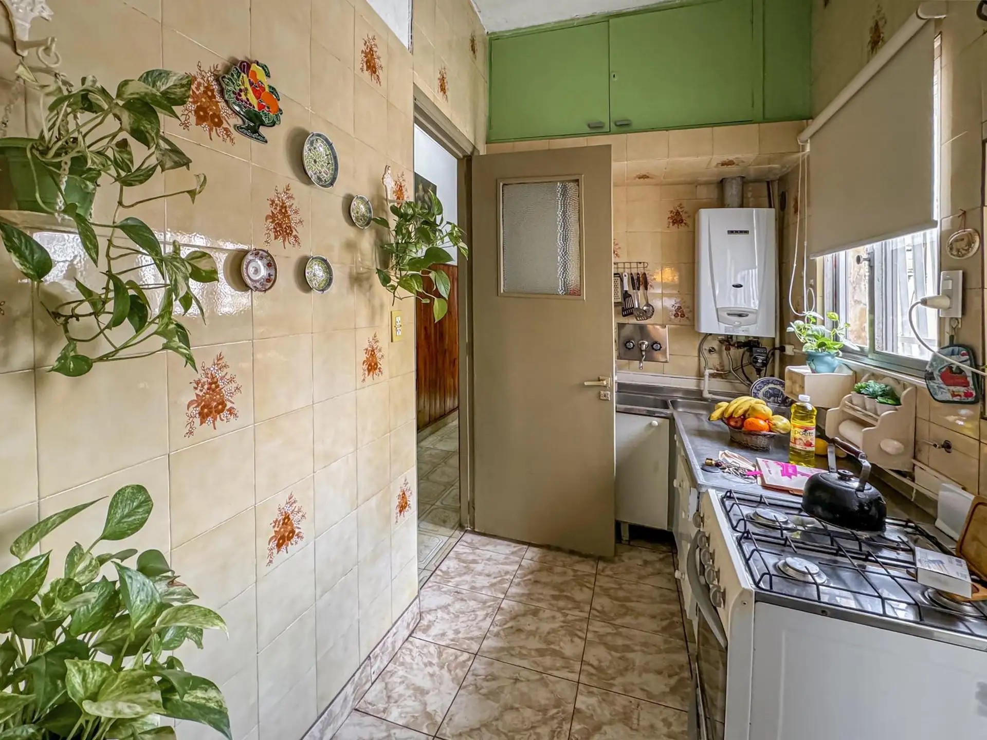 Pasillo amplio conectado a los íntimos: primer baño toilette, luego las habitaciones de grandes dimensiones, una con balcón al contrafrente. Calidad solida de época con pisos de madera en combinación con cerámica, aberturas metálicas y/o en aluminio con correcto enrejamiento y persianas de enrollar, placares completos con interiores, baños en perfecto estado. Cocina separada con mesada en acero inoxidable, bacha en el mismo material, alacena y bajo mesada colocado, cocina a gas instalada y calefón. Calefacción por estufas a gas.